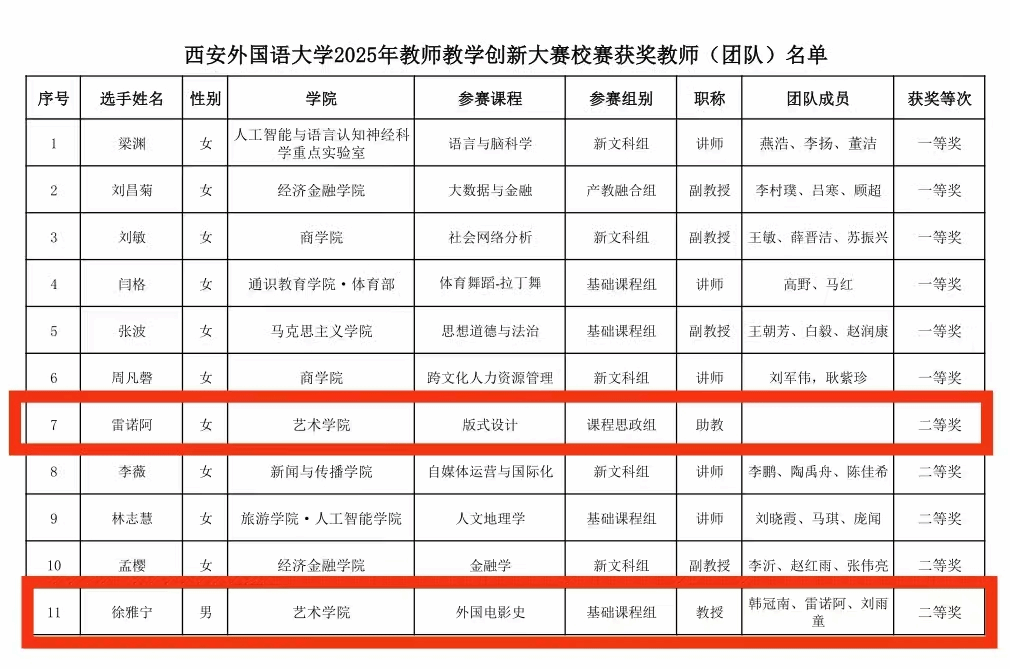 在此,向徐雅宁老师、雷诺阿老师表示热烈祝贺!期待艺术学院教师在教学创新之路上持续探索,再创佳绩!