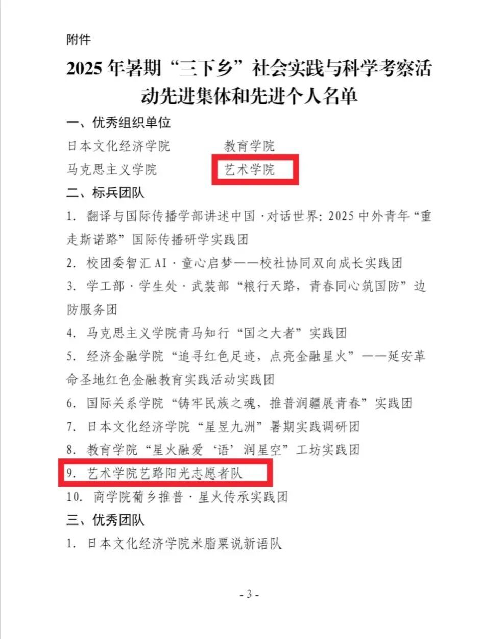 作为学院实践育人的重要载体,2025年暑期,艺术学院紧紧围绕“青春为中国式现代化挺膺担当”主题,结合学科特色精心谋划实践方案,通过前期动员宣讲、团队专项培训、实践过程督导、成果集中转化等全流程保障,组织两支团队深入基层开展服务。从艺术赋能乡村儿童到文化服务基层群众,学院以专业所长回应社会需求,构建了特色鲜明、成效显著的实践育人体系,“优秀组织单位”荣誉是对学院统筹推进实践工作的充分肯定。