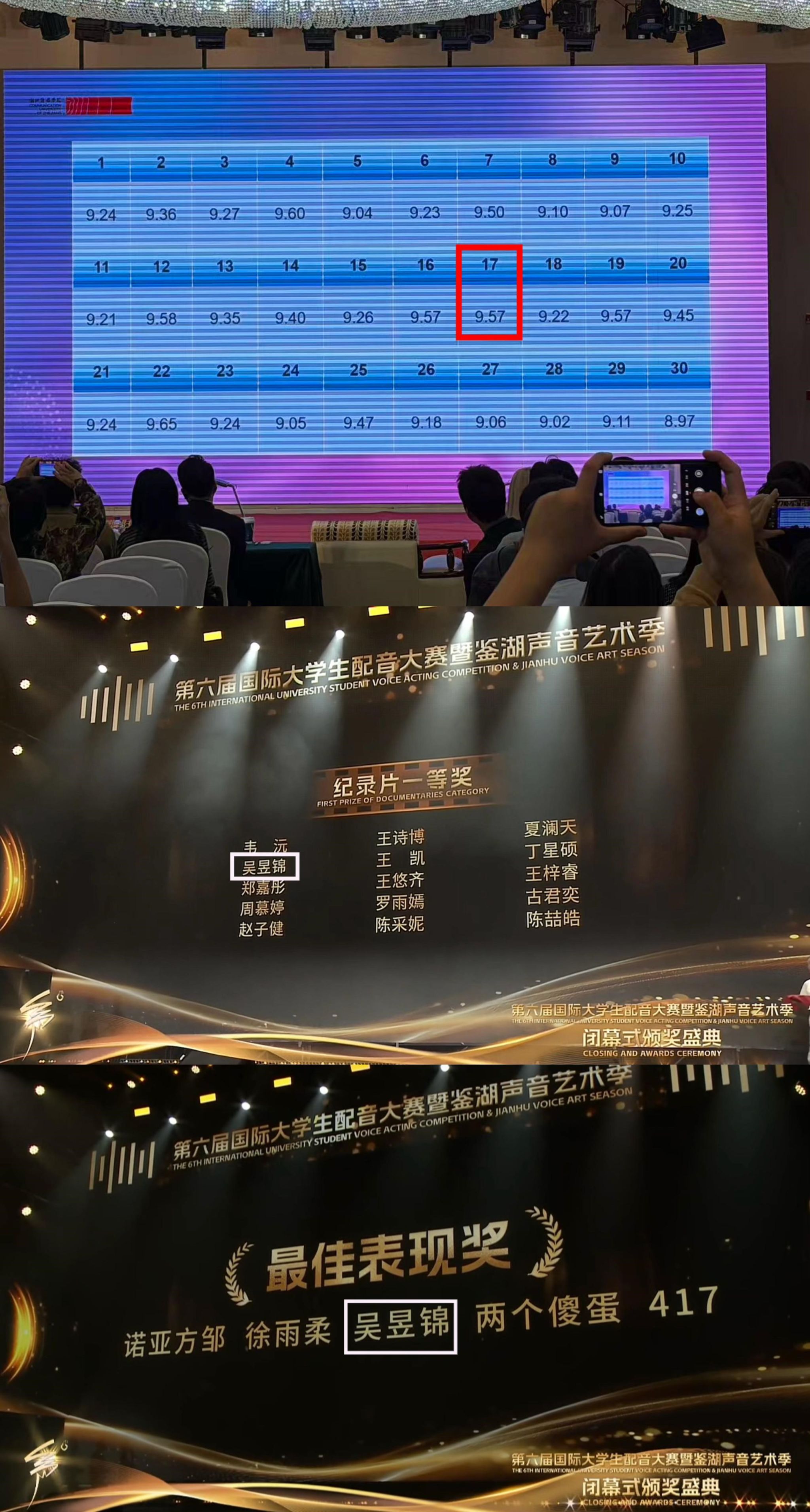 经过激烈角逐,我院2023级表演专业吴昱锦同学脱颖而出,以9.57的高分荣获个人纪录片赛道一等奖,同时斩获该赛道的“最佳表现奖”!