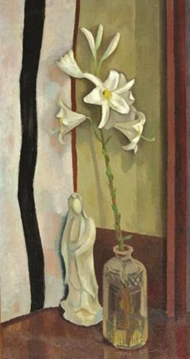 罗杰·弗莱不仅在艺术理论中对东方文化进行肯定,在创作中也将中国元素、技法、构图与西方绘画进行融合。如他在1917年创作的《百合花》(如图2)中,可以明确见到中国元素的应用。画面中的桌子上摆放着一个玻璃花瓶,瓶中插有一枝百合花,旁边立有一尊魏代的观音像,虽然画作名为“百合花”,但观音像才是画面的重点。观音像的出现使画作带有强烈的中国色彩。而这尊观音像正是弗莱本人的收藏,他1913年从巴黎的展览上购入后就爱不释手,并称“该美术馆所包含的展览‘全是鬼斧神工之作,其中最美的当属魏代雕塑,其优美程度无与伦比。”[⑤]可见其对中国文化的热爱程度之高。同时画面的色彩也以中国传统绘画常用的白色、土黄色和棕色为主,色调温暖典雅,充满禅意画的意境。